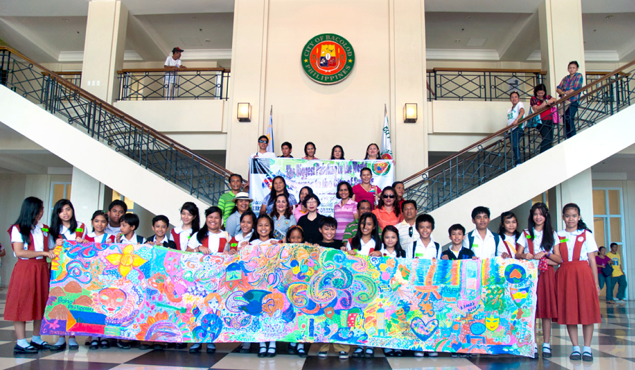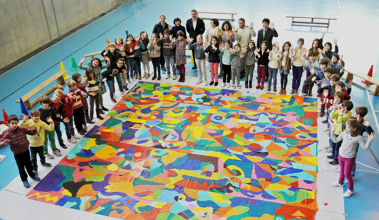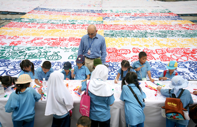Elle a donc proposé aux 13,000 enfants de peindre sur 1000 tissus de 1m×10m.