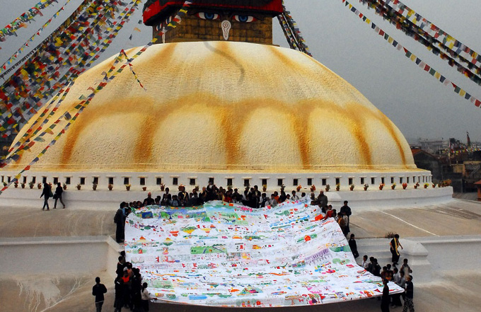 - March 2009, show off in front of at Kathmandu, Nepal is a world heritage Boudhanath Stupa (pagoda).